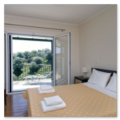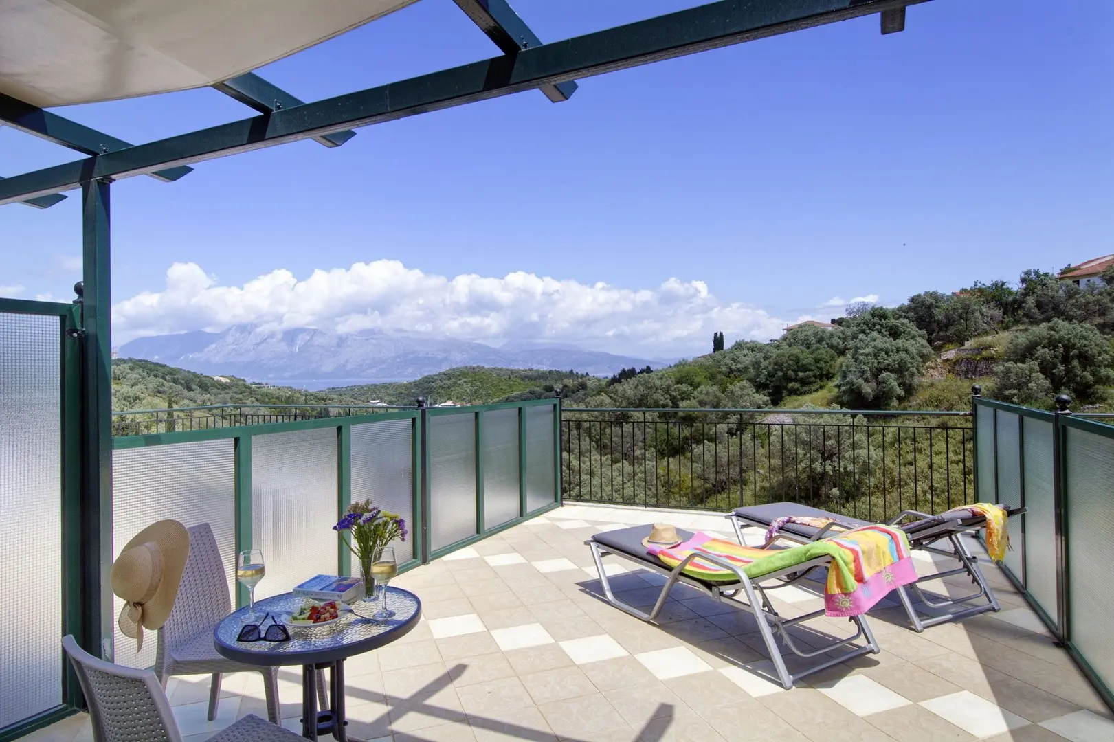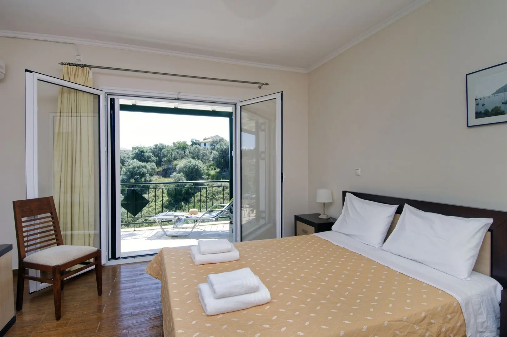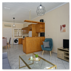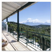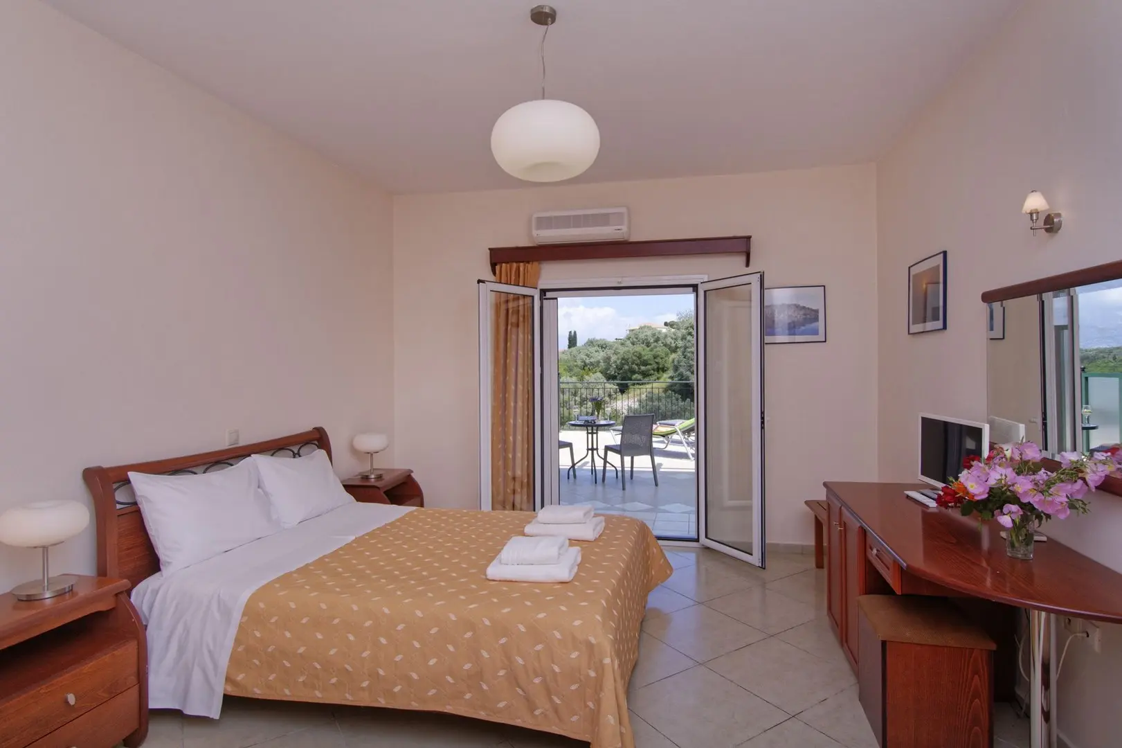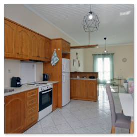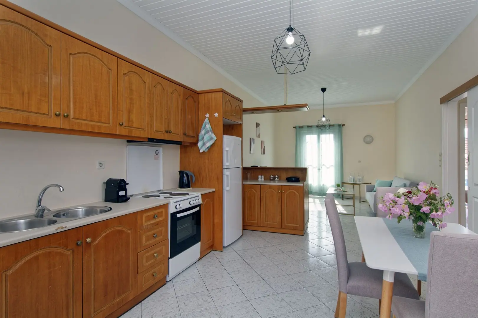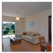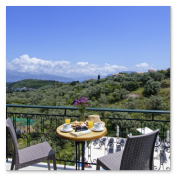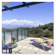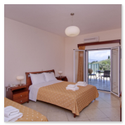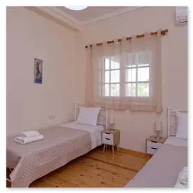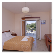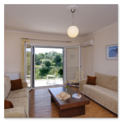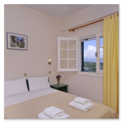 It is completely self contained with a fully equipped kitchen and an open plan dining and living area. There are two bedrooms and a bathroom as well as a large terrace to the rear with views down to Atherinos Bay. Both bedrooms and the living / dining area are fully air conditioned and there is wi fi throughout.